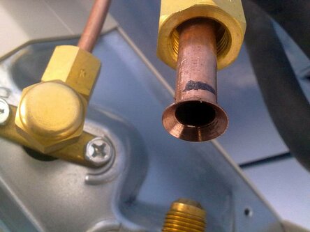 После развальцовки, труба подсоединяется к соответствующему выходу, на который накручивается гайка. Запрещено использовать какие-либо герметизирующие средства и прокладки. Надёжность соединения обеспечивает материал трубопровода – медь высокого качества. При правильно выполненной развальцовке герметизация происходит без использования дополнительных средств.