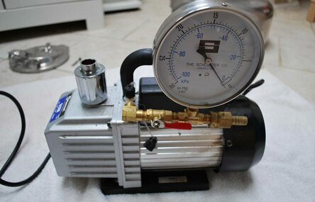 Шланг подсоединяется к золотнику толстого трубопровода. При этом оба вентиля должны быть закрыты. После коммутации вакуумного насоса к системе он включается и оставляется работать на 15-30 минут. Этого времени вполне хватает, чтобы откачать из трубопроводов воздух и остальные примеси.